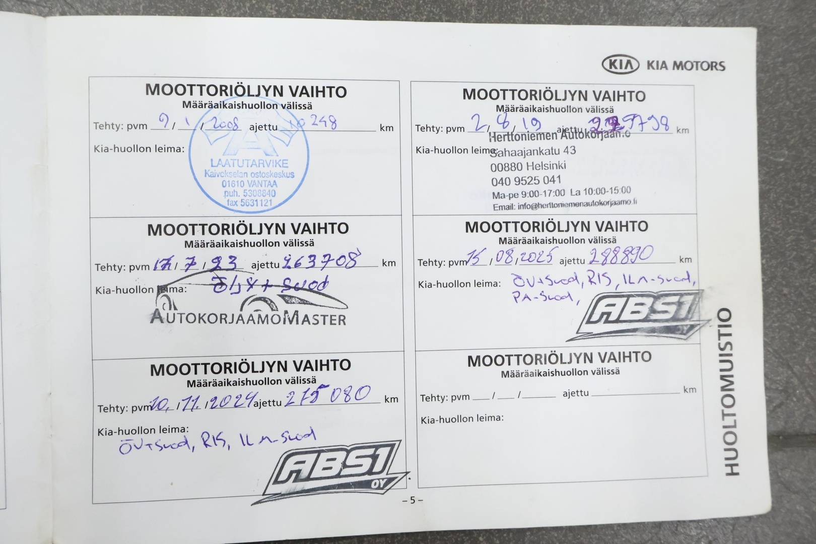 - Viimeisin huolto tehty 288 890km kohdalla, 08 / 2025