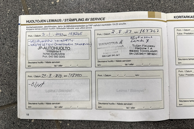 - Viimeisin huolto tehty 178 000km kohdalla, 08 / 2024