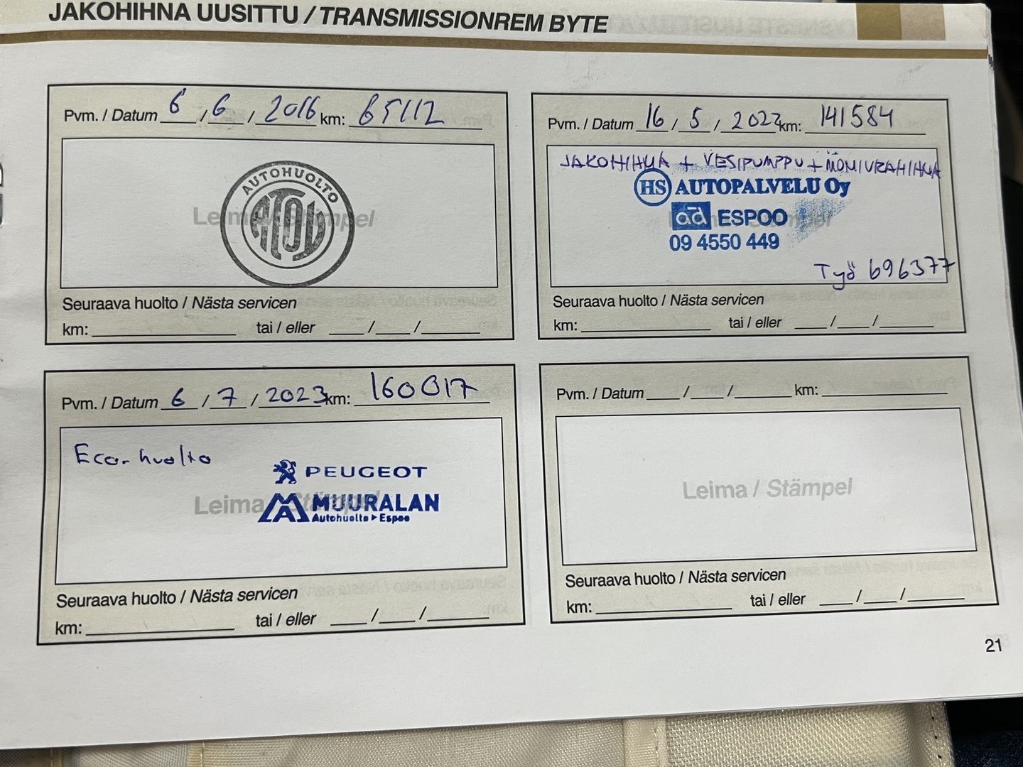 - Jakohihna vaihdettu 141 584km kohdalla, 05 / 2022