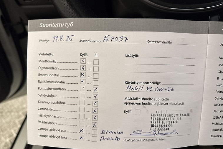 • Viimeisin huolto tehty 187 037km kohdalla, 08/2025