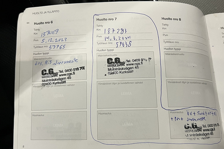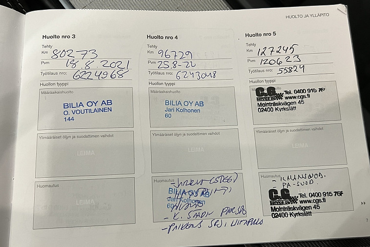 - Suomi-auto, kaksi omistajaa, käyttöönotto 05/2019. Huoltokirja on paperinen, viimeisin huolto tehty 07/2025 (248 887 km) ja jakohihna vaihdettu 12/2023 (157 067 km).